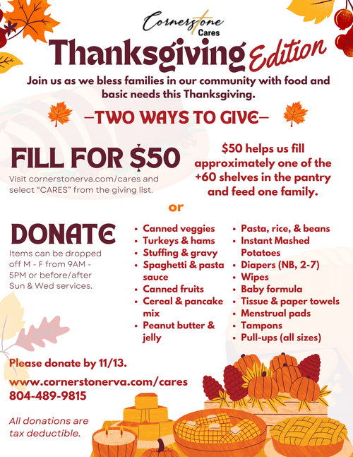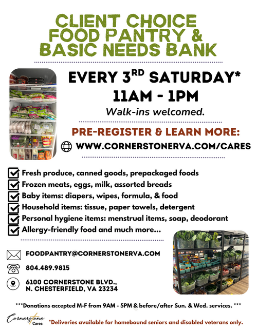 Questions? Email us at foodpantry@cornerstonerva.com or call us 804-489-9815.